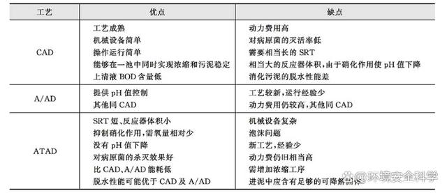 VD工艺的主要技术经济指标:a.占地面积为传统污泥消化工艺的10%~20%;b.处理后的挥发性固体至少降低40%;c.离心脱水后含水率可降低到70%以下;d.去除每1kg挥发性固体耗电小于1.4kW·h,对于城市污水而言,相当于每1m3水耗电0.06kW·h;e.氧传质效率约50%。 污泥好氧消化主要工艺各有优缺点,具体情况如下图所列。