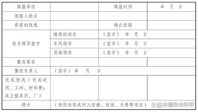 “隐患整改追踪记录卡”的使用和内容如下。 根据“安全检查表”中发现的安全隐患或不安全因素,不能处理的,在采取防范措施的同时,认真填写“隐患整改追踪记录卡”,一式三份或三联,一份交包修组负责人签字后退回备查,一份安排检修,一份交车间领导签字后退包修组备查。包修组无法处理的,将余下的两份“隐患整改追踪记录卡”报车间领导,一份车间安全员备案后安排检修或上报厂部(车间无法处理的)。“隐患整改追踪记录卡”在哪个环节受阻,就由哪个环节承担其事故责任。 来源: www.ws46.com |