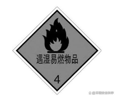 ②图案颜色。符号:黑色;底色:上白下红。 ③用途。用于货物外包装上。表示包装体内为自燃性物质,即使不与明火接触,在适当的温度下也能发生氧化作用,放出热量,因积热达到自燃点而引起燃烧。例如,天那水、黄磷、白磷、磷化氢等产品。 (8)遇湿易燃物品标志 ①图形。