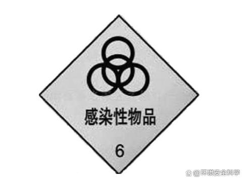 ②图案颜色。符号:黑色;底色:白色。 ③用途。用于货物外包装上。表示包装体内为有害物品,不能与食品接近。这种物品和食品的垂直、水平间隔距离至少应为3m。 (14)感染性物品标志 ①图形。