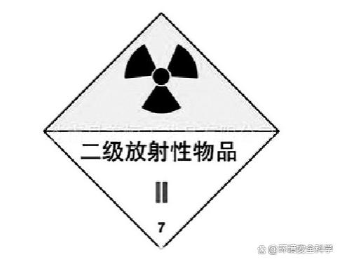 ②图案颜色。符号:黑色;底色:白色,附一条红竖线。 ③用途。用于货物外包装上。表示包装体内为放射量较小的一级放射性物品,能自发地、不断地放出α、β、γ等射线。 (16)二级放射性物品标志 ①图形。