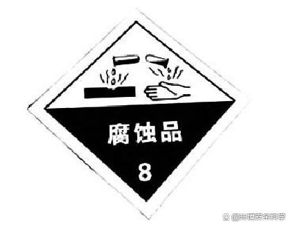 ②图案颜色。符号:上黑下白;底色:上白下黑。 ③用途。用于货物外包装上。表示包装体内为带腐蚀性的物品,如硫酸、盐酸、硝酸、氢氧化钾等产品,具有较强的腐蚀性,接触人体或物品后,即产生腐蚀作用,出现破坏现象,甚至引起燃烧、爆炸,造成伤亡的货物。 |