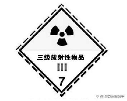 ②图案颜色。符号:黑色;底色:白色,附两条红竖线。 ③用途。用于货物包装上。表示包装体内为放射量中等的二级放射性物品,能自发地、不断地放出α、β、γ等射线。 (17)三级放射性物品标志 ①图形。