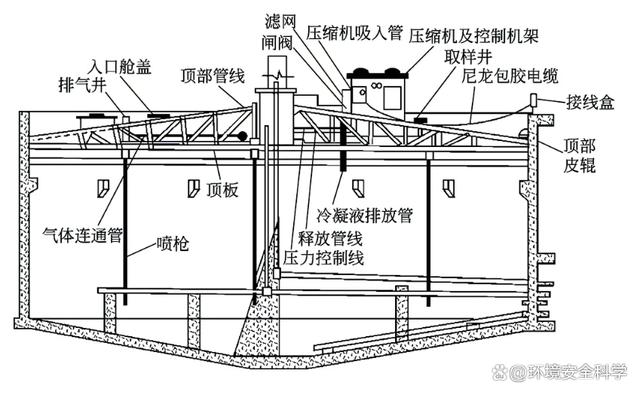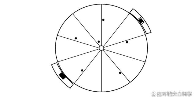 机械搅拌系统采用旋转的螺旋桨对消化池内容物进行搅拌。搅拌机可以是安装在排气筒内的高速桨叶或低速涡轮,可以选择在消化池的内部或者外部安装排气筒。水泵搅拌和机械搅拌系统的流动方向均是从池顶到池底。与之相反,气体搅拌系统从池底到池顶。机械搅拌系统存在对液位敏感、搅拌桨易被碎屑和碎纤维阻碍的缺点。 在水泵搅拌系统中,安装在池外的水泵从顶部中央位置吸取生物污泥,然后通过喷嘴以切线方向从池底注入至消化池。液相表面通过安装破碎浮渣用的喷嘴可间断地破碎积累的浮渣。低水头高流量输送“污泥”的水泵有轴流泵、离心螺旋泵和混流泵。泵通常以传送带驱动,可根据消化池内固体浓度变化而进行调节。www.ws46.com 多点喷射气体循环系统由分布于整个池内的多根喷射管组成,是一种常用的不定向系统。气体可经旋转阀门有序地从一根管换至另一根管,或者经过所有的管子达到连续排放。一般情况,旋转阀门按预先设定的定时器自动控制操作。喷气管安装在距消化池中心约2/3处。为保证中心部位的有效混合,会增设一根喷枪于距中心几米处的位置。此外,系统还要有压缩机及控制设备。 多点顺序喷气系统的剖面如图2所示。气体排放管的直径在50mm及以上,设计方案时须尽可能地使气体排放管集中。喷枪的淹没深度是决定气体流量的一个重要因素。图3是喷枪系统的平面图,13~15m直径的消化池中装备有6支喷枪。