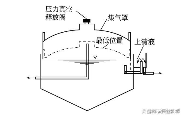 浮动集气罩和浮动罩相类似,许多设计原则基本相同。集气罩提供了延伸的边缘供集气用。浮动集气罩的顶罩通常是浮在气垫上而不是直接浮在污泥上,是经改进的浮动罩(见图3),其改进措施包括增长的利于贮气的边缘和一个使罩子稳定地浮于气相之上的特殊导引系统。当顶罩下气体的体积变化时,顶罩会按比例升降。顶罩下压力的微小变化,体积就会作相应的变化。浮动集气罩的设计可以增加气体贮存空间,气体贮存空间允许产气量和污水厂运行负荷的变化。