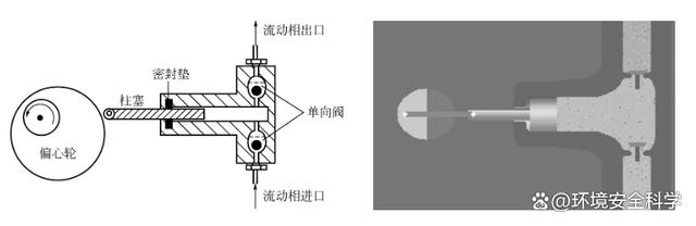 (1)避免物料泄漏导致事故 ①保证泵的安装基础坚固,避免因运转时产生机械振动造成法兰联接处松动和管路焊接处破裂,使物料泄漏。 ②操作前及时压紧填料函(松紧适度),以防物料泄漏。 (2)避免空气吸入引起爆炸 ①开动离心泵前,必须向泵壳内充满被输送的液体,保证泵壳和吸入管内无空气积存,同时避免“气缚”现象。 ②吸入口的位置应适当,避免吸入口产生负压,空气进入系统导致爆炸,或抽瘪设备。一般情况下泵入口设在容器底部或液体深处。 (3)防止静电引起燃烧 ①在输送可燃液体时,管内流速不应大于安全流速。 ②管道应有可靠的接地措施。 (4)避免轴承过热引起燃烧 ①填料函的松紧应适度,不能过紧,以免轴承过热。 ②保证运行系统有良好的润滑。 ③避免泵超负荷运行。 (5)防止绞伤 由于电机的高速运转,泵和电机的联轴节处容易发生对人员的绞伤,因此,联轴节处应安装安全防护罩。 2.往复泵的危险性分析及安全控制要求 往复泵主要由泵体、活塞(或活柱)和两个单向活门构成。依靠活塞的往复运动将外能以静压力形式直接传给液态物料,借以传送。 蒸汽往复泵以蒸汽为驱动力,不用电和其他动力,可以避免产生火花,故而特别适用于输送易燃液体。当输送酸性和悬浮液时,选用隔膜往复泵较为安全。往复泵示意如图3-8所示。