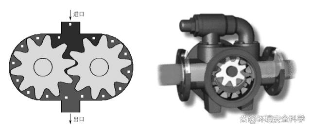 ①往复泵开动前,需对各运动部件进行检査。观察活塞、缸套是否磨损,吸液管上的垫片是否适合法兰大小,以防泄漏。 ②各注油处应适当加油润滑。 ③开车时,将泵体内壳充满水,排除缸内空气。若在出口装有阀门时,需将出口阀门打开。 3.旋转泵的危险性分析及安全控制要求 旋转泵同往复泵一样,同属于正位移泵。同往复泵的主要区别是泵中没有活门,只有在泵中旋转着的转子。旋转泵依靠旋转时排送液体,留出空间形成低压将液体连续吸入和排出。常见的旋转泵有齿轮泵、转子泵、螺旋泵、偏心旋转泵和叶片泵等。旋转泵示意如图3-9所示。