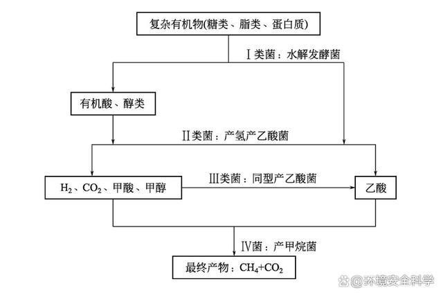 在厌氧消化过程中,参与反应的细菌分为两大类:一类是产氢产乙酸菌、水解酸化菌和同型产乙酸菌等非产甲烷菌;另一类是产甲烷菌。由于微生物种群之间的生态平衡关系是支配厌氧消化过程的本质规律,所以在本节中着重介绍厌氧消化过程微生物的种类、特性及其相互代谢关系。 (1)厌氧消化过程微生物种类 1)非产甲烷菌 ① 水解发酵菌(产酸细菌)。主要的发酵产酸细菌包括梭菌属、拟杆菌属、丁酸弧菌属、双歧杆菌属等。其主要功能是水解和酸化作用。水解——在胞外酶的作用下,将不溶性大分子有机物水解成可溶性有机物;酸化——将可溶性大分子有机物转化为乙酸、丙酸、丁酸、戊酸等有机酸及醇类等。水解发酵细菌的水解过程较缓慢,并受SRT、pH值、有机物种类等多种因素的影响,但产酸反应的速率较快。发酵产酸细菌可以按功能分为蛋白质分解菌、半纤维素分解菌、淀粉分解菌、纤维素分解菌、脂肪分解菌等。 ② 产氢产乙酸菌。该类细菌的主要功能是将各种高级脂肪酸和醇类氧化分解为乙酸、CO2和H2,为产甲烷阶段提供合适的基质,在厌氧系统中常常与产甲烷细菌处于共生互营关系。主要的产氢产乙酸反应有: