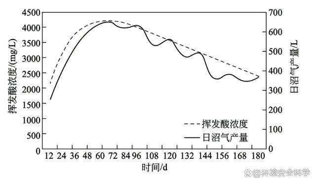 (2)厌氧消化过程中微生物的代谢关系 厌氧消化是一个多菌群共同代谢的过程,各类菌群之间的代谢作用相辅相成。在整个厌氧代谢过程中,产甲烷菌并不是孤立进行的,它周围众多的菌群先于产甲烷菌代谢,以此提供产甲烷菌正常代谢的条件。从物质代谢转化的角度来看,首先,有机物的大分子水解,把纤维素、半纤维素、果胶、淀粉、脂类和蛋白质等物质,经水解发酵生成水溶性糖、醇、酸等分子较小的化合物;然后,微生物进一步把较小分子的化合物降解形成产甲烷菌可直接利用的底物,主要是乙酸盐、H2和CO2等;最后,产甲烷菌才能利用极简单的小分子化合物代谢产生CH4和CO2。有机物质在经过厌氧生物转化为甲烷的过程中,涉及一系列微生物菌群代谢,它们的底物和特性完全不同。整个转化过程可以描述为许多种不同微生物类群的直接和间接的共生联合关系。确定的9个步骤分别由专门的菌群调节代谢,这9个步骤分别为:a.有机聚合物水解成有机单体,如糖、有机酸和氨基酸等;b.有机单体转化成氢、重碳酸盐、乙酸、丙酸和丁酸以及其他有机产物如乙醇、乳酸等;c.产氢产乙酸菌对还原性有机物具有氧化作用,能生成氢气、重碳酸盐和乙酸;d.同型乙酸菌对重碳酸盐的产乙酸呼吸作用;e.硝酸盐还原菌(NRB)和硫酸盐还原菌(SRB)对还原性有机物的氧化作用生成重碳酸盐硼乙酸;f.NRB和SRB对乙酸的氧化作用,生成重碳酸盐;g.NRB和SRB对氢气的氧化作用;h.裂解乙酸的甲烷发酵;i.重碳酸盐的产甲烷呼吸作用。 在厌氧消化过程中,微生物的相互作用实质上是各类微生物在代谢上的相互影响。每一种微生物都有其自身的代谢途径,它们可以在特定的环境中单独行使其代谢功能。因此,研究它们的代谢条件和代谢途径是非常有用的。但在厌氧消化反应器这样一个杂居的环境中,各类型的微生物生活在一起,各自进行自身特有的代谢,并形成各自的代谢产物,彼此之间的相互作用,使它们能正常进行生命活动,然而它们所形成的代谢产物可能引起如下后果:a.产物累积引起的反馈抑制效应;b.代谢产物被其他菌群利用,促进其生长;c.抑制其他菌群;d.造成有利或不利于其他菌群的生态环境。 这些问题在厌氧消化反应器中都有可能出现,而在厌氧消化正常运行或运行失败时,代谢产物的种类及其浓度都有很大的差别,代谢产物引发的问题和后果也完全不同。在正常的厌氧消化过程中,各种微生物代谢过程发生相互偶联,产物得到协调,整个消化过程达到平衡。相反,任何一个代谢过程的失调都有可能引发整个过程的破坏,使厌氧消化过程失衡。因此,研究厌氧消化微生物的相互关联性是一个重要且复杂的内容。 (3)甲烷发酵过程微生物的代谢关联性 对厌氧消化过程中发酵液和气体成分进行分析,特别是将一些功能菌的代谢产物进行分析,就不难发现微生物之间的代谢关系。 1)水解酸化菌与产甲烷菌之间的相互关系 下图所示为某反应器内污泥厌氧消化过程中挥发酸和日沼气产量的关系。在厌氧消化开始后的初期阶段,反应器内大量产酸,挥发酸的浓度最高可达4000mg/L,此时反应器内以水解酸化过程为主,此后,反应过程逐渐过渡到产甲烷阶段。反应器内水解酸化阶段和产甲烷阶段是两个无法在绝对意义上分开的过程,这主要是由产酸过程和产甲烷过程没有达到代谢平衡所致。由于产酸菌的繁殖速率较高,在厌氧消化开始初期就大量繁殖,产生较大量的挥发酸,而产甲烷菌的繁殖速率较慢,因此,水解酸化细菌代谢产生的挥发酸不能及时地被产甲烷菌利用,故此阶段主要表现为挥发酸的积累。当产甲烷菌数量增加、微生物区系相对完善后,挥发酸很快被消耗,产甲烷则成为主要特征。由于在挥发酸增强的同时,产甲烷菌的数量不断增加,沼气产量也随之增加,此时水解酸化阶段和产甲烷阶段构成一个连续的过程。因此可以采用增加接种物的办法缩短这两个阶段之间的时间差,使产甲烷阶段提前。研究人员曾在污泥厌氧消化试验中,在反应器内接种容积量35%的厌氧消化液作为启动微生物,此时反应器在第2日即可正常产气,第4日即可达到产气高峰,而接种反应器容积量15%的厌氧消化液时,产气高峰出现在第9日,这说明增加接种物的用量可以较好地保证反应器的正常启动,也说明水解酸化阶段和产甲烷阶段是可以人为调控的。