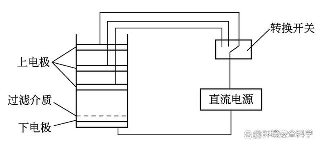 可采用多阶段电极,将上电极切换到第二个电极工作,脱水即可继续进行,该方法能显著提高脱水速率,降低物料的最终含水率。以膨润土进行的三阶段电极为例,其与单阶段电极相比,最终电渗透流量大约是单阶段电极的3倍。三阶段电极电渗透工艺如图所示。但是,在实际应用过程中中间电极的装卸比较困难。