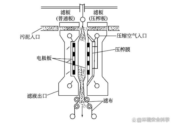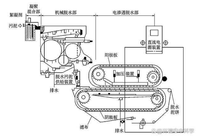 对于污泥来说,电渗透脱水是给污泥施加一定的直流电压,利用污泥粒子和水分子相互向相反的极性方向分离移动的现象进行脱水。水分的移动量与施加的电流量成正比。为了有效地利用电渗透力,在实际应用中,电渗透脱水大多是在传统的机械脱水工艺中引入直流电场,利用机械压榨力和电场作用力两种结合的方式进行深度脱水。