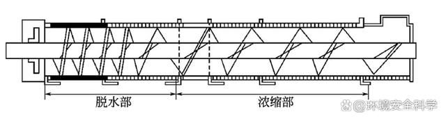 碟片式离心机的处理能力通常为120~10000L/h,沉降距离较小的悬浮颗粒容易被捕捉,通过转筒上的细孔连续排出,其密度浓缩5~20倍。由于转筒上细孔的直径为1.27~2.54mm,因而该离心机对污泥的浓度和粒径有一定要求。碟片式离心机(分离板型离心机)的Z一般大于3500,甚至达到10000,主要用于密度非常接近的液体、细微粒径的乳浊液或悬浊液等高度分散液体的固液分离,由于这些液体中的颗粒组成相近、粒径小、沉降速度低,因而需分离因数高的离心机才能将其分开。碟片式离心机也可以进行固体、油、水3种物质的分离。其脱水能力不是很强,目前主要用于分离一般离心机难分离的悬浊液或者三相分离的物质。 (3)叠螺脱水机 叠螺脱水机的螺旋主体由固定环和游动环相互层叠而成,螺旋轴贯穿其中。前段为浓缩部,后段为脱水部。从浓缩部到脱水部,固定环和游动环之间形成的滤缝以及螺旋轴的螺距逐渐变小,在推动污泥从浓缩部输送到脱水部的同时,旋转的螺旋轴也不断带动游动环清扫滤缝,防止堵塞。叠螺脱水机的结构如图所示。