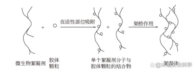 由于絮凝反应是多种作用共同产生的结果,形成过程非常复杂,任何某种机理均不能独立解释清楚所有的现象。以下将分别对比较具有代表性的吸附架桥学说、电性中和学说等进行介绍。 1)吸附架桥机理 虽然微生物絮凝剂的种类和性质各不相同,但均可通过离子键、氢键等作用与液体中悬浮的胶体颗粒相结合。由于在低浓度微生物絮凝剂环境中,呈链状结构的微生物絮凝剂可以同时附着在多个胶体微粒的表面,致使由微生物絮凝剂分子与胶体颗粒的结合物之间再通过细胞外聚合物进行搭桥相连,形成一种“胶体颗粒-微生物絮凝剂高分子物质-胶体颗粒”的三维网状聚合物,从而削弱了胶体的稳定性,聚合成较为紧密的絮凝体,并在重力的作用下从液体中沉淀分离出来。这就是利用微生物絮凝剂的吸附架桥作用来实现絮凝的过程。微生物絮凝剂的吸附架桥机理如图所示。