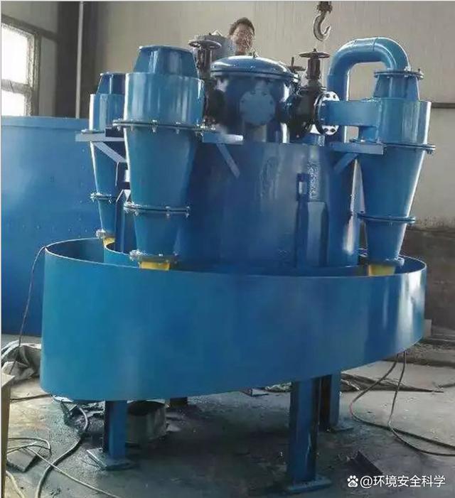 2)水力旋流器 水力旋流器的上部呈圆柱形,下部星圆锥形,圆柱体的中央插入一根溢流管,上部外侧有一与其相切的进浆管,主要用于细粒级的分级、矿浆浓缩、脱泥脱水等。