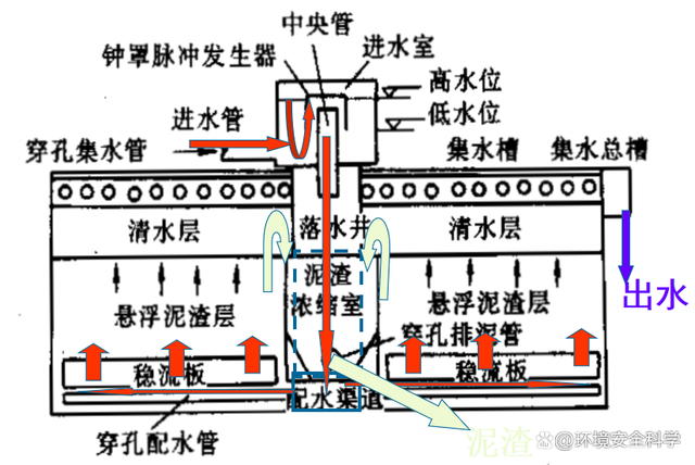 脉冲澄清池的工作过程可分为两个阶段,从进水室水位开始上升到虹吸作用开始称为充水阶段,由虹吸作用开始到虹吸作用破坏称为放水阶段。 脉冲澄清池两次充水相隔时间称为脉冲周期,约30–40s,其中充水时间约为25–30s,放水时间5–10s。 |