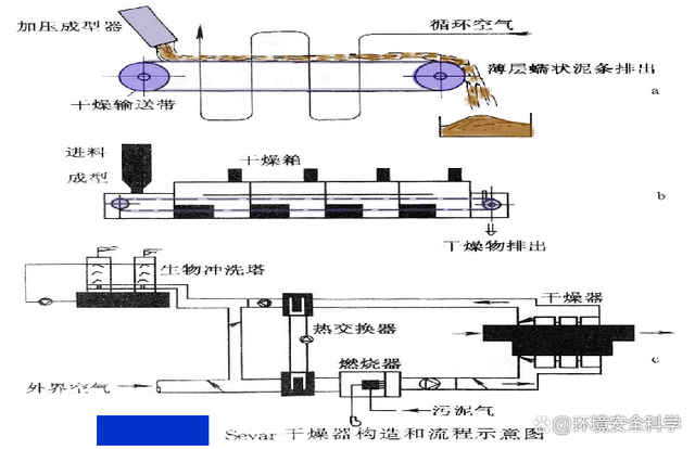 2. 流化床焚化炉 炉下都堆放一层厚约0.9m的砂层。热空气由下部鼓入,在815℃使砂层呈流化状态。污泥投加到砂层中后,水分迅速蒸发,进而进行燃烧。废气由炉顶引入空气预热器使空气预热,之后经除尘净化后排放。流化床炉还设有投砂口、点火器、辅助燃料燃烧等设备。除砂流化床外,还可用污泥固体作流化床。 3. Sevar干燥器