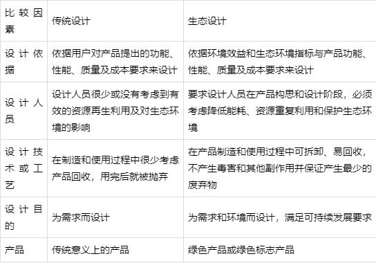 3.生态设计有利于保护环境,维护生态系统平衡 4.生态设计可以防止地球上矿物资源的枯竭 5.生态设计的结果是减少了废弃物数量及其处理的棘手问题 (4)生态设计和传统设计的关系 表 生态设计与传统设计的关系比较