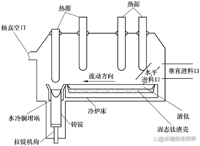 (2)冷床炉熔炼技术 冷床炉在设计上将熔炼过程分为3个区域:熔化区、精炼区和结晶区。在熔化区,原料由固态变成液态后流向精炼区;在精炼区,由于钛液在冷床上可停留较长时间,可有效去除易挥发杂质(如H、Cl、Ca、Mg等),低密度夹杂(如TiN)可以上浮至熔池表面通过溶解消除,而高密度杂质(如W、WC等)则可以下沉至冷床底部被凝壳捕获,并充分实现合金化、减小偏析;最后通过溢流嘴流入结晶器,凝固成圆形铸锭或扁锭。