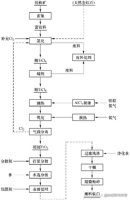 氯化法经过原矿准备、氯化物制备、钛的氯化物氧化、二氧化钛表面处理。环节:矿焦干燥、矿焦粉碎、氯化、钛的氯化物精制、钛的氯化物氧化、二氧化钛打浆分散分级、无机表面处理、水洗、干燥、气流粉碎和有机处理、包装、废副产品的回收、处理和利用。