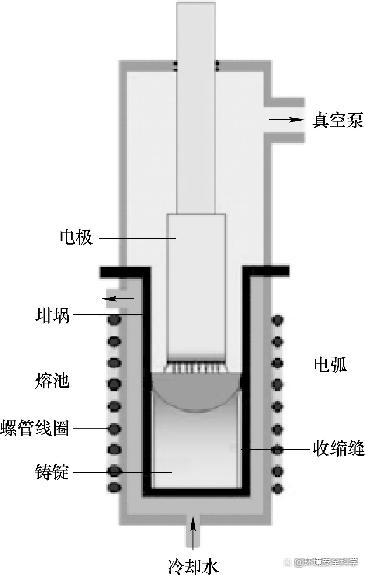 2.3 致密钛生产 只有将海绵钛或钛粉制成致密的可锻性金属,才能进行机械加工并广泛地应用于各个工业部门。采用真空熔炼法或粉末冶金的方法就可实现这一目的。 (1)真空自耗电弧熔炼法生产致密钛 自耗电极电弧熔炼(VAR)是将待熔炼的金属钛制成棒状阴极,水冷铜坩埚作阳极,在阴、阳极之间高温电弧的作用下,钛阴极逐渐熔化并滴入水冷铜坩埚内凝固成锭。