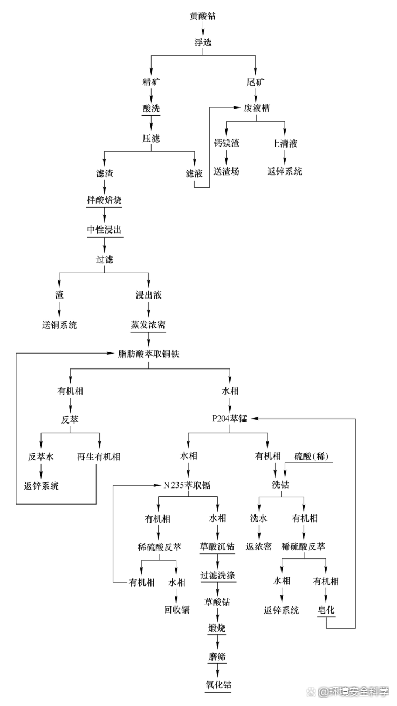 (1)原料:铜镉渣、铜镉钴渣,根据渣的特性,选择性球磨,d>0.2mm的小于5%。 (2)铜镉渣浸出:液固比6~7:1、浸出温度70~90℃,PH调整用石灰乳和氧化锌中和。 (3)置换:锌粉置换,第一段:80%Zn粉量,海绵镉品位高;第二段用剩余锌粉置换,得低品位镉,返回第一段置换作业。或者:第一段30%Zn置换砷,第二段剩余Zn沉淀海绵镉。 (4)除钴:硫酸锌溶液净化采用锌粉除铜-镉——黄药除钴流程。 (5)海绵镉溶解造液:给镉电积制备电解溶液,终时加入高锰酸钾,再加石灰乳中和,铁水解沉淀。 (6)除铜:采用新鲜海绵镉置换法除铜。 (7)镉电解沉积 (8)熔铸:400~550℃,熔锅内加苛性钠,厚度10~20mm,锭模温度100~120℃,铸模时覆盖碱5~10mm,防治缩孔。 (9)蒸馏精炼:枝状镉与熔铸浮渣,水洗后,真空。蒸馏精炼。 L. 从黄酸钴中回收钴 硫化锌精矿一般含钴0.0003%~0.007%,平均钴0.005%就需要回收。湿法炼锌时,30~40%Co进入溶液,用黄药净化除钴后,钴进入黄酸钴中,从黄酸钴中提钴的工艺见图。 该工艺特点: (1)磺酸盐疏水性。浮选法富集钴,除掉钙镁锌铁的氧化物;(2)酸洗除去黄酸钴中的锌和锰;(3)硫酸化焙烧,分解黄酸钴,生成可溶性硫酸钴,挥发除砷锑;(4)萃取除铜、锰、锌、铜、铁等杂质。