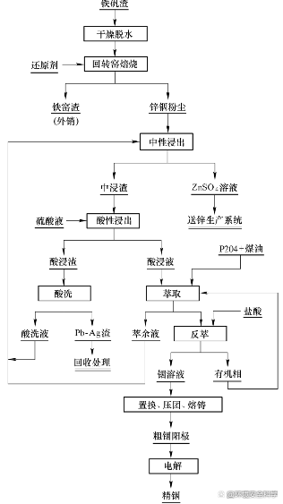 从氧化锌粉酸浸液中直接萃取回收铟的工艺流程 C. 从铁矾渣中回收铟 该工艺主要分为:铁矾渣焙烧、粗铟制取、铟电解。 (1)渣附着水30%,需干燥,干燥料与还原剂配料后进入焙烧窑,铟铁分离,95%铁进入渣,作水泥添加剂,烟尘主要是铟锌粉尘,送粗铟提取工序。 (2)铟锌粉尘中性浸出分离,硫酸锌溶液净化后送去电解锌或生产硫酸锌。中浸渣中In酸浸,渣为Pb、Ag;铟溶液用P204和溶剂油萃取,用NaOH洗涤沉淀Fe,In3 再用盐酸反萃,之后用Zn或Al还原置换得到海绵铟,压团、阳极铸造得到粗铟阳极板,电解后得到铟锭。 (3)电解的铟阴极片,煮熔,加甘油、碘化钾等进行精炼,除镉。