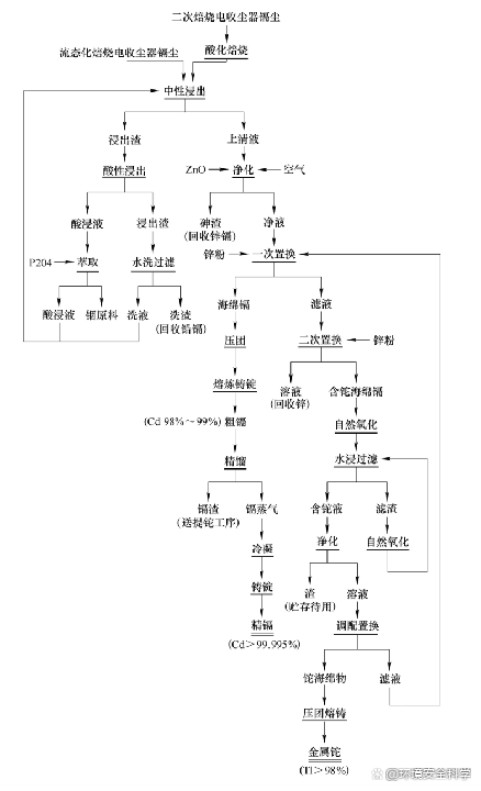 包括:熔盐除铊,真空蒸馏除镉和电解精炼。 1)熔盐除铊:铊容易进入氯化锌与氯化铵熔盐,温度543~553K,1h,除铊率80%~90%,铟中含锌0.001%~0.022%; 2)真空蒸馏除镉:真空感应电炉/管式电炉,镉含量<0.0004%; 3)电解精炼:使铟中的铅铜锡进入阳极泥,锌铁铝进入电解液,进一步在常温下提纯,阴极为纯铟板或高纯铝板,阳极为真空蒸馏后的粗铟,可得到99.99%铟。 B. 从含镉烟尘中提取镉与铊
