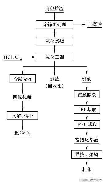 F. 从锌真空蒸馏渣中提取铟 密闭鼓风炉炼锌工艺中,真空蒸馏锌,铟沸点较高留在蒸馏残渣中,铟锗含量较高,可采用蒸馏-萃取联合处理。先浸出收锌,浸出渣氧化焙烧,再氯化蒸馏,锗与铟分离。铟液稀释除铅,滤液用铁置换除杂,再萃取、反萃取等工序后,得到富铟液,中和除杂,置换、压团、熔铸得99%的粗铟。