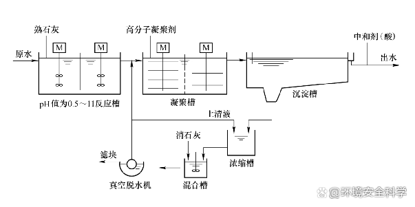3. 废水中重金属离子的综合利用 重金属一般指Hg、Cd、Pb、Cr和类金属As等生理毒性显著的元素,也指具有一定毒性的一般重金属,如Zn、Cu、Co、Ni和Sn等。比如锌冶炼排放大量的Zn、Cr、Cu、Pb、Cd、As和Hg。第一类污染物: Cd、As、Pb和Hg,严格控制排放。 (1)中和沉淀法 向重金属废水中投加碱性中和剂,使金属离子与羟基反应,生成难溶金属氢氧化物沉淀,分离。 A. 中和凝聚法 碱性溶液中,铝盐和铁盐生成吸附能力很强的胶团,可吸附重金属离子,还能捕集和包裹悬液重金属沉淀。 用中和凝聚沉淀法处理锌冶炼废水先经消石灰中和,后加凝聚剂,再沉淀排出。污泥浓缩、真空脱水外运。