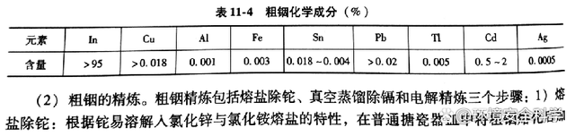 B. 从氧化锌粉酸浸液中直接萃取回收铟 (1)真空蒸馏法除镉 铟与镉蒸气压不同,沸点相差悬殊,真空炉中蒸馏法分离。 (2)甘油碘化法除镉 K2CdI4易溶于甘油使铟得到净化,将电铟用蒸馏水洗净,放入装有甘油的搪瓷容器内,控制温度180~190℃,加碘和碘化钾, K2CdI4溶于甘油,镉含量降至0.0001%以下。 (3)除铊 歧化法(氯化物熔体萃取法),铊和铟在NH4Cl熔体中选择性溶解分离。除镉铊的铟用苛性钠覆盖,加热铸锭。