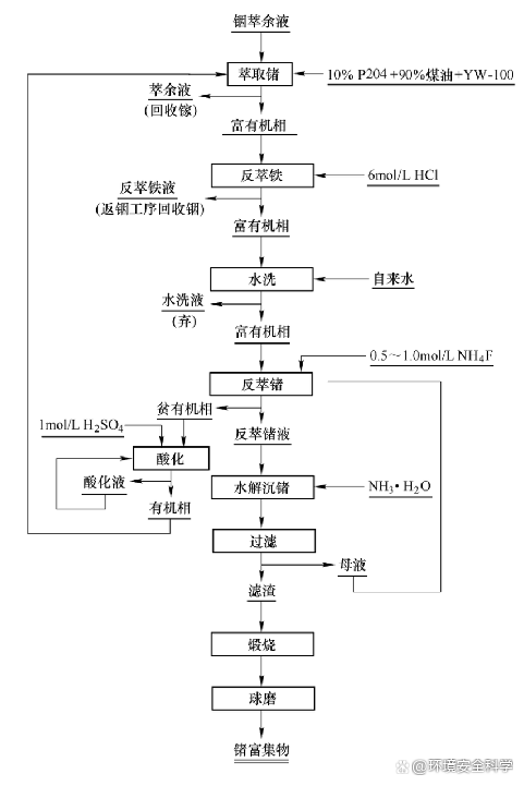 G. 从氧化锌粉酸浸液中回收锗、镓 (1) 从氧化锌粉酸浸液中回收锗 丹宁沉锗消耗量大,且丹宁对锌电解的电流效率影响不良,该工艺采用P204 YW-100协调萃取。
