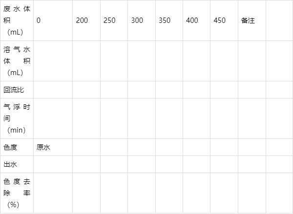 (7)从溶气罐取样口向各水样中注入溶气水,使最终体积为500mL。静置20~30min,取样测定色度。实验数据填入下表;