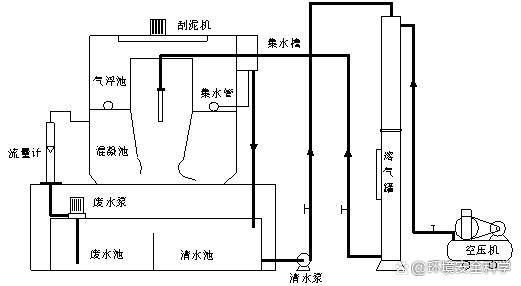(4)启动空气压缩机,待气泵内有一定压力时开启清水泵,同时向加压溶气罐内注水、进气,打开溶气罐的气阀;
