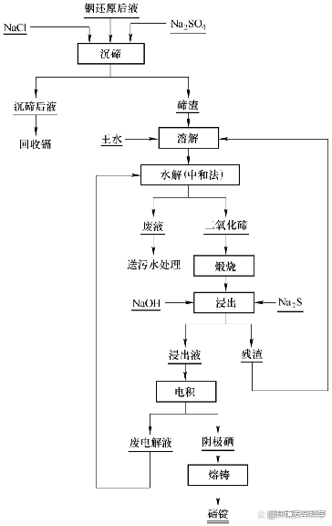 硒和碲是稀散伴生金属, ①硒是半导体材料,主要来自斑铜矿和铜黄铁矿,大部分硒从铅电解阳极泥中回收,少量从铅鼓风炉中回收。 常温下, ②碲不与氧作用,加热着火燃烧生成TeO2,碲不溶于水、稀酸/碱,溶于强热碱,用于炼钢添加剂,合金与玻璃、半导体等行业。碲矿物中碲含量极低,0.001%~0.1%。多从铜、铅阳极泥和制酸的铅式泥或炼铅鼓风炉中提取。