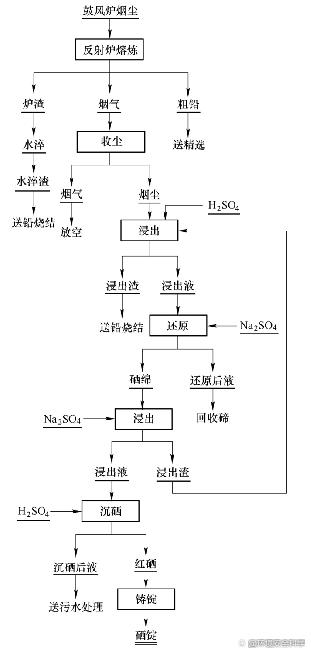 排出的鼓风炉熔炼烟气,经收尘后,其含Pb、Cd、Se、Te等元素可返回炉料配料,以利用有价金属。 (3)烟化烟气