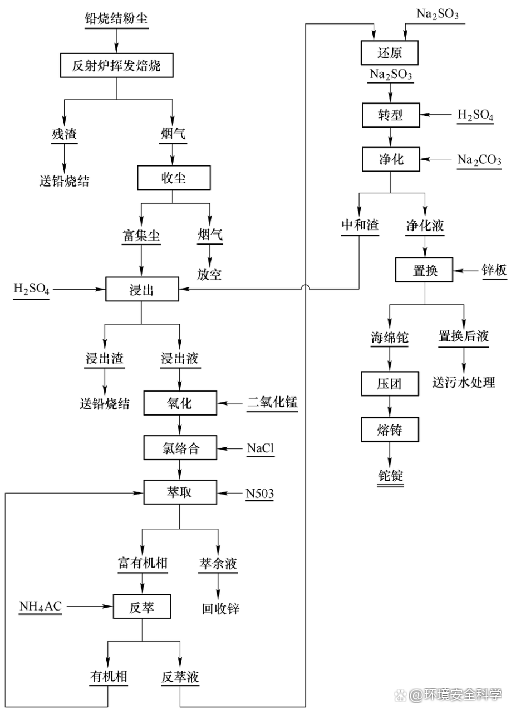 富集的含铊烟尘,跟浓硫酸进行硫酸化焙烧(250℃),用水浸出热焙砂,以氯化钠做沉淀剂,生成氯化铊沉淀,固液分离,再将氯化铊进行二次硫酸化焙烧和浸出,浸出液用铊碱中和,并通入硫化氢气体除去重金属杂质,再用锌片置换,得到海绵铊,洗净、压团、熔铸得到纯度为99.99%以上的铊产品。 (2)萃取转型法:富集烟尘硫酸浸出,氧化,并与氯化钠反应,再醋酸铵反萃取,亚硫酸钠还原铊离子,加入硫酸使氯化铊转型成硫酸铊,再加碳酸钠中和至PH=8,除镉,锌板置换,得海绵铊,洗净、压团、熔铸。