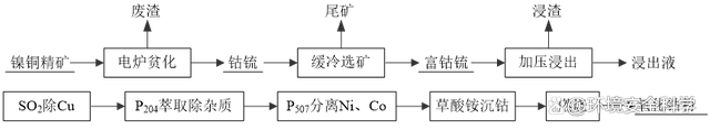 高温高压下,氧气将镍钴铜氧化成可溶性硫酸盐,使铁留在渣中,选择性浸出。先用硫代硫酸钠除铜后,再用P204深度除铜。萃余液用P507进行镍钴分离,之后萃余液硫酸镍,用草酸铵沉钴,草酸钴煅烧得氧化钴粉末。