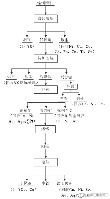 1.镍冶炼过程中产生的废弃物及伴生元素的走向 镍造锍:镍铜钴金银和铂族金属富集于低镍锍中,烟尘-稀散金属; 转炉吹炼:镍铜钴金银和铂族金属富集于高镍锍中,控氧可使钴部分进入转炉渣或镍锍。高镍锍缓冷分选出镍精矿-金银和铂族金属在镍电解阳极泥;通镍合金-回收铂族金属主要原料。