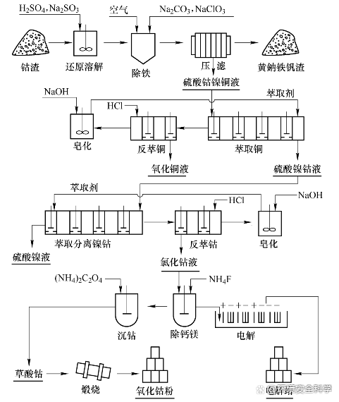 C. 镍电解净液钴渣中生产氧化钴 a 钴溶液净化:黄钠铁矾法除铁(钴渣浆化、加硫酸、通二氧化硫还原溶解。黄钠铁矾法除铁,后液用次氯酸钠沉钴生成氢氧化钴,二次溶解与沉钴后的氢氧化钴反射炉煅烧和电炉还原熔炼,铸成钴阳极板,在氯化物介质中,通过可溶阳极电解成电解钴,钴电解阳极液净化-硫化钠除铜、通氯氧化中和除铁。硫酸镍溶液返回镍电解系统。);萃取剂净化提纯:P204-镍钴分离;P507-优良镍钴分离萃取剂