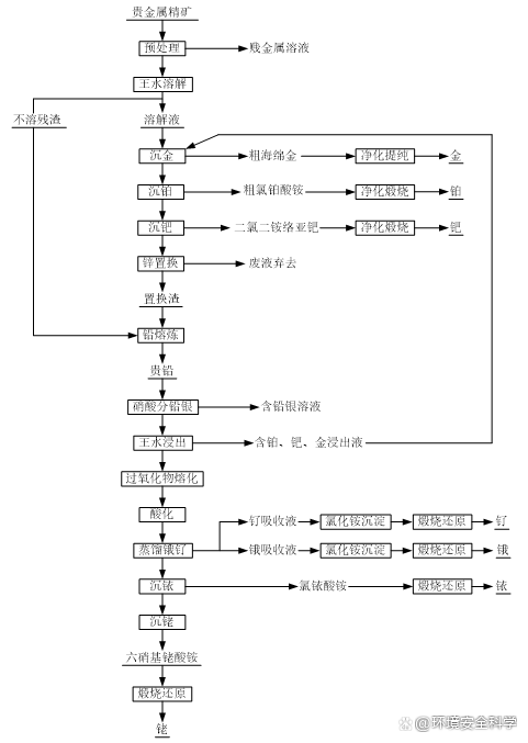 贵金属分离提纯传统工艺流程图 贵金属精矿首先采用焙烧-浸出法使贱金属溶解,得到的浸出渣再用王水溶解,使金属进入溶液。再用氯化亚铁、硫酸亚铁或二氧化硫作还原剂,使金呈海绵状沉淀,再经反复溶解、还原或用电解法提纯制取纯金。沉金后液加入氯化铵,铂呈氯铂酸铵沉淀,经反复溶解、沉淀制取纯氯铂酸铵,再煅烧后得纯海绵铂。沉铂后加氯化铵与氨水,使钯呈二氯二氨络亚钯沉淀,经过反复酸化溶解与配合沉淀,得纯二氯二氨络亚钯,再经煅烧、还原得到纯海绵钯。