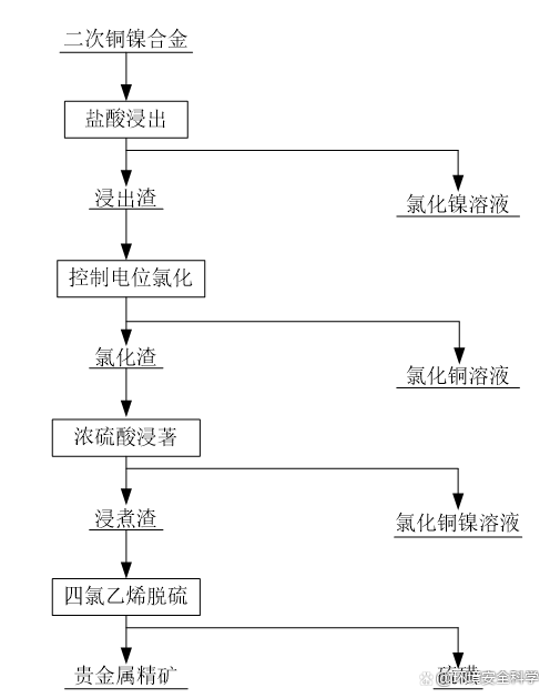 从二次合金富集贵金属精矿的工艺流程,可看出来,主要过程包括盐酸浸出、控制电位氯化浸出、浓硫酸浸煮和四氯乙烯脱硫等工作。 贵金属精矿分离提纯方法(1)氧化蒸馏分离提取锇钌;(2)铜粉置换和铂、钯、铑、铱、金的分离提纯。 |