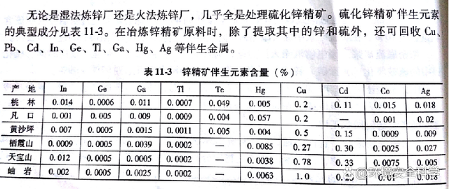 无论是湿法炼锌厂,几乎全是处理硫化锌精矿。硫化锌精矿伴生元素的典型成分见表。在冶炼锌精矿原料时,除了提取其中的锌和硫外,还可回收铜、铅、铬、铟、镉、钛、锗、汞、银等伴生金属。