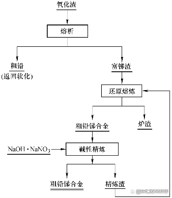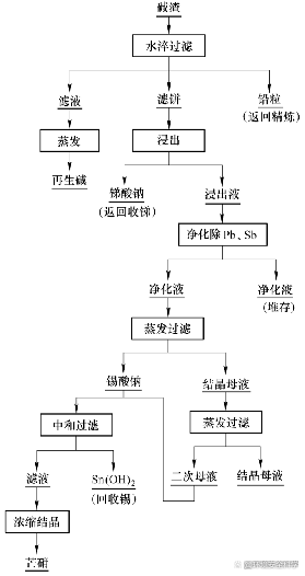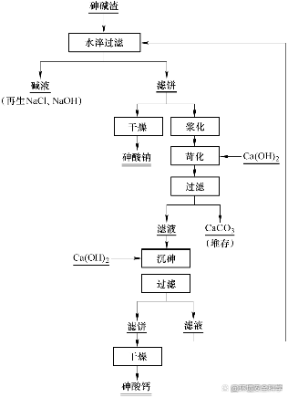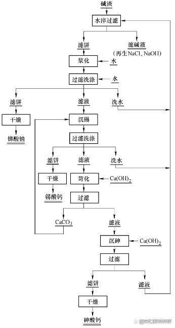 (2)稀碱渣处理 1)从碱渣中只回收碱;(www.ws46.coM) 2)从砷碱渣中回收砷; 3)从锡碱渣中回收锡; 4)从锑碱渣中回收锑; 5)从砷、锡、锑碱渣中全面回收碱、砷、锑和锡