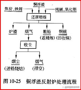 反射炉熔炼:纯碱-铁屑法处理铜浮渣,利用纯碱使砷和锑生成钠盐进入炉渣,造钠铜锍,加铁屑降低铜锍和渣中含铅,提高铜锍中铜铅比。 反射炉纯碱-铁屑法处理铜浮渣的优点: (1)铅回收率高,可达97%; (2)铜锍中含铅较低,铜铅比5~9; (3)流程适应性强,处理效果较好; (4)投资少 缺点:劳动条件差、热效率低,炉衬腐蚀快