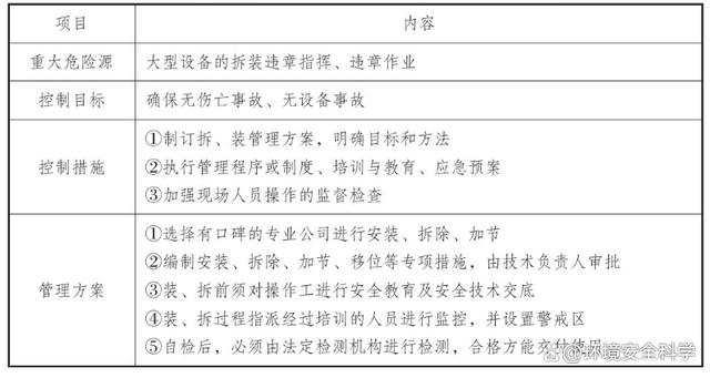 (1)制订重大危险源控制目标和管理方案。针对所确定的重大危险源,企业必须制订重大危险源控制目标和管理方案,做到危险源管理有理有据、有规可循、有法可依。对每一项重大危险源都要有控制措施,包括控制目标、控制措施、管理方案等,最后应落实实施部门、检查部门,以及完成时间。比如某企业对大型设备的拆装作业的管理细则见图1。