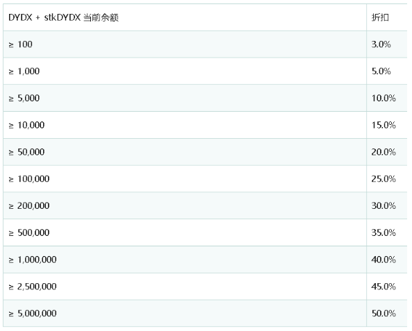 DYDX币有是用途DYDX是dYdX的治理代币,于2021年推出,总流通数量为10亿枚,计画在五年内发给所有dYdX生态参与方用户可以透过在DEX上的交易活动赚取DYDX代币,并支付所有费用和未结利息,也可以透过抵押现有的加密代币来获得DYDX的收益。 DYDX 币的用途主要有以下三点: 1、参与治理、投票 作为治理代币,DYDX 币具有投票、参与治理的功能 2、手续费折扣 作为交易平台的代币,DYDX和币安币一样,持有人可以根据其当前持有的规模获得交易费折扣: