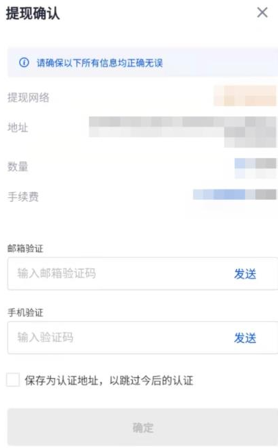4. 点击提交后若地址并未保存为认证地址,则需要进行提现二次确认,需要邮箱验证/手机验证,点击确定后提币申请就提交成功了。