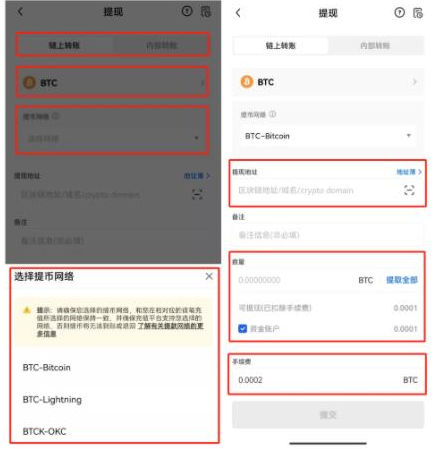 2. 选择需要提币的币种 ,例如BTC,选择提币方式,目前平台支持链上提现 和内部转账 两种提币方式,链上提现需要选择并确定提现网络 ,输入提现地址 ,提币数量 以及手续费 。 !注:选择提现网络时,要与其他交易所或钱包【充值/充币网络】保持一致,例如都为BTC-Bitcoin,以免造成资产丢失。