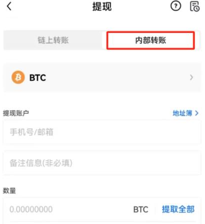 3. 若进行内部转账需要输入提现账户 、提币数量 。内部转账仅限 同为欧易平台用户之间进行操作。