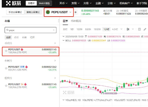 5.在搜索框内搜PEPE币,找到PEPE/USDT,大家可以查看PEPE币的实时行情。